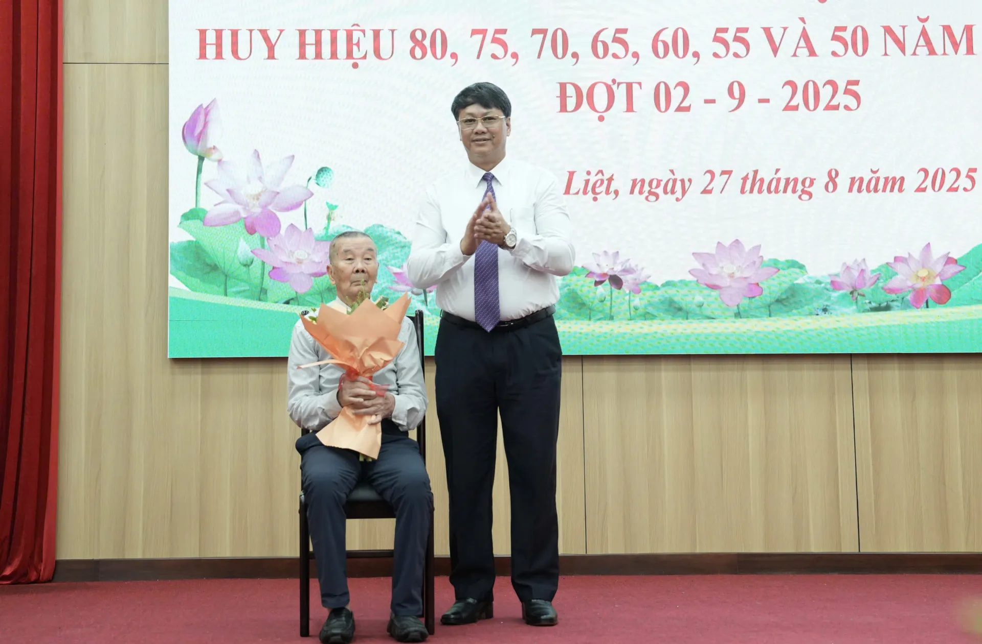 Trong đó, 1 đảng viên nhận Huy hiệu 80 năm tuổi Đảng; 1 đảng viên nhận Huy hiệu 75 năm tuổi Đảng; 1 đảng viên nhận Huy hiệu 70 năm tuổi Đảng; 2 đảng viên nhận Huy hiệu 65 năm tuổi Đảng; 29 đảng viên nhận Huy hiệu 60 năm tuổi Đảng; 14 đảng viên nhận Huy hiệu 55 năm tuổi Đảng; 28 đảng viên nhận Huy hiệu 50 năm tuổi Đảng; 65 đảng viên nhận Huy hiệu 45 năm tuổi Đảng; 68 đảng viên nhận Huy hiệu 40 năm tuổi Đảng; 35 đảng viên nhận Huy hiệu 30 năm tuổi Đảng.