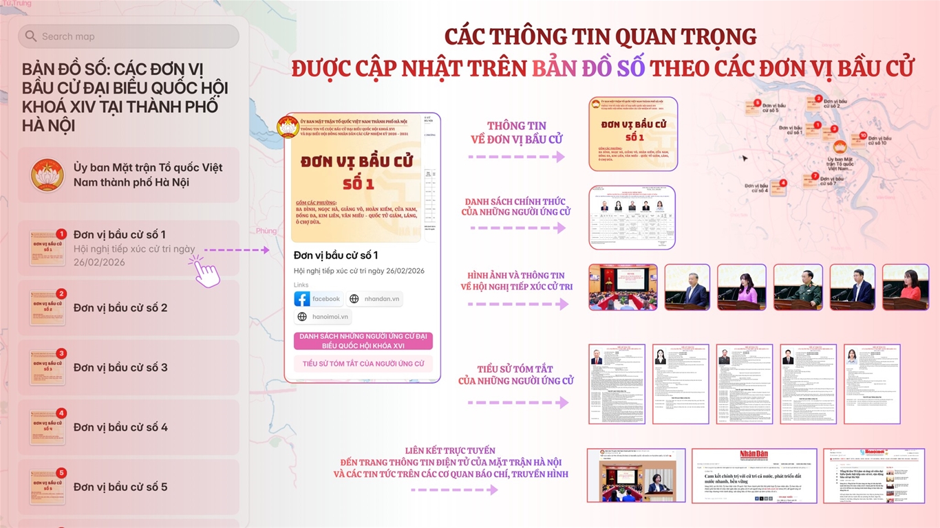 Nhằm đẩy mạnh công tác tuyên truyền, ứng dụng chuyển đổi số trong thông tin bầu cử, Ủy ban MTTQ Việt Nam thành phố Hà Nội giới thiệu Sản phẩm truyền thông đặc biệt “Bản đồ số thông tin về bầu cử đại biểu Quốc hội khóa XVI và đại biểu Hội đồng nhân dân thành phố Hà Nội nhiệm kỳ 2026 - 2031”.