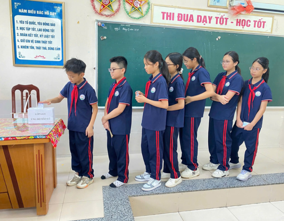 Các trường Tiểu học, THCS tại Hà Nội quyên góp ủng hộ ủng hộ đồng bào các tỉnh miền Trung - Tây Nguyên bị ảnh hưởng bởi mưa bảo - Ảnh: M.D.