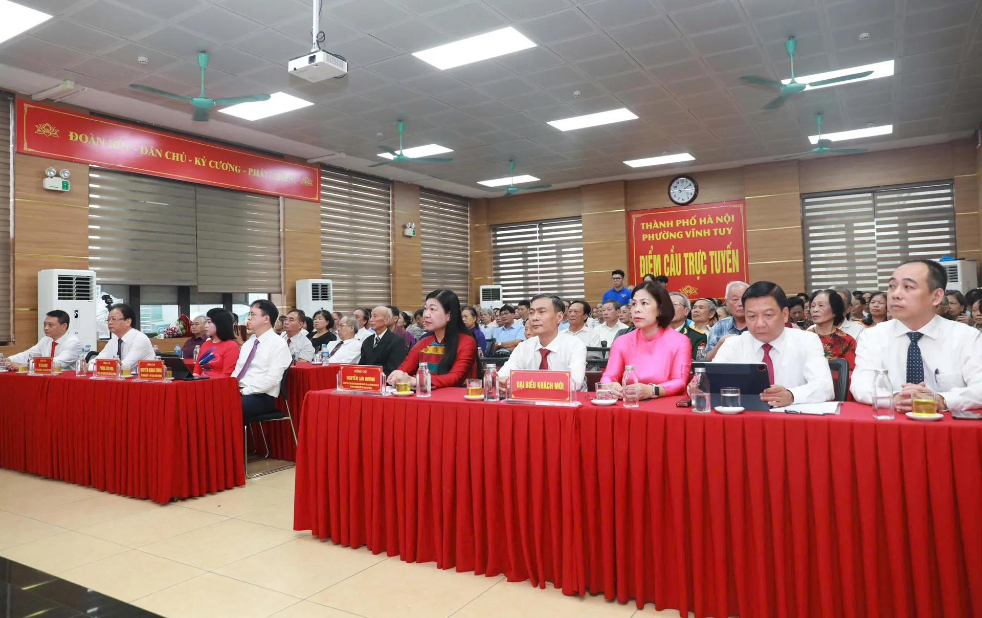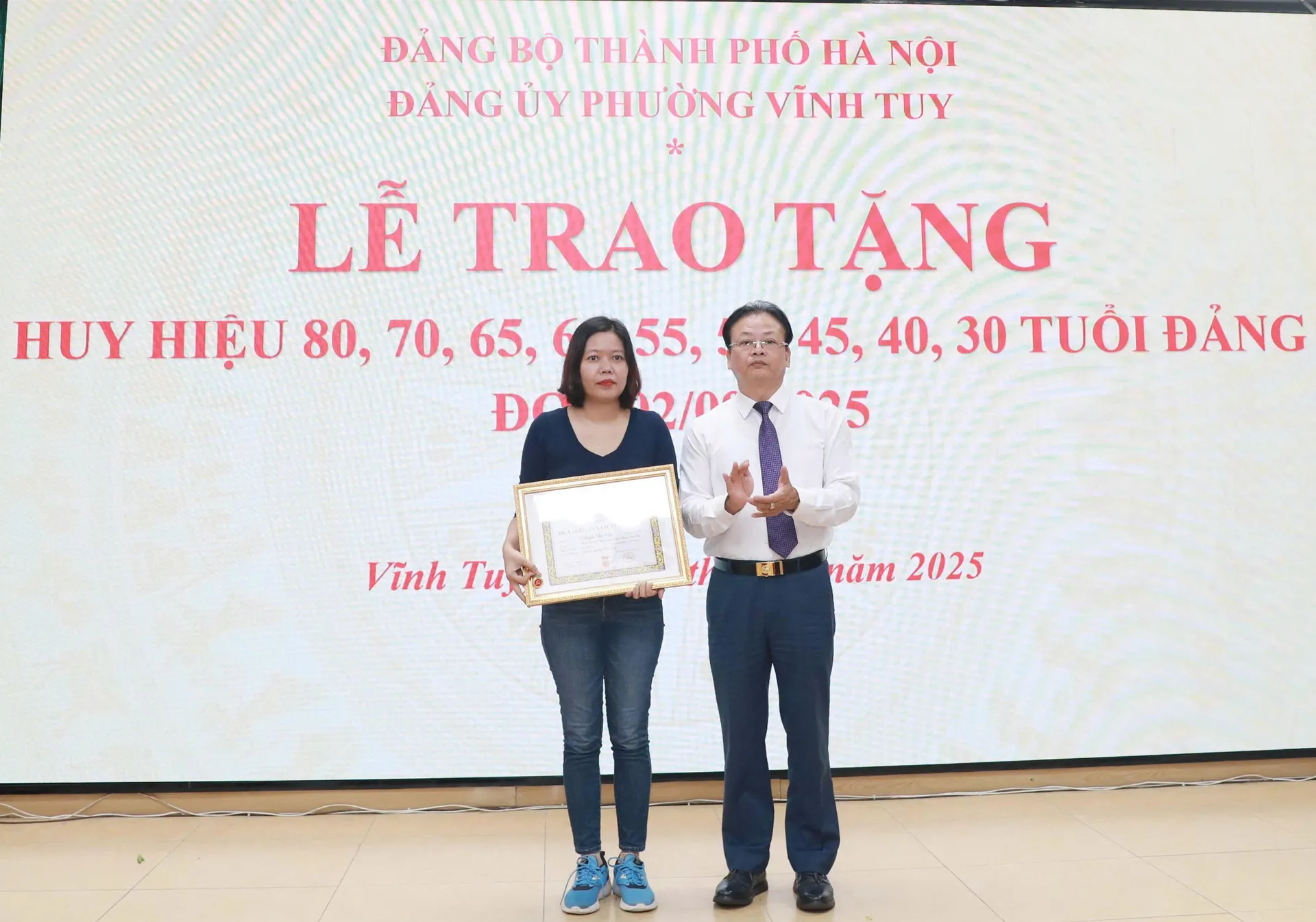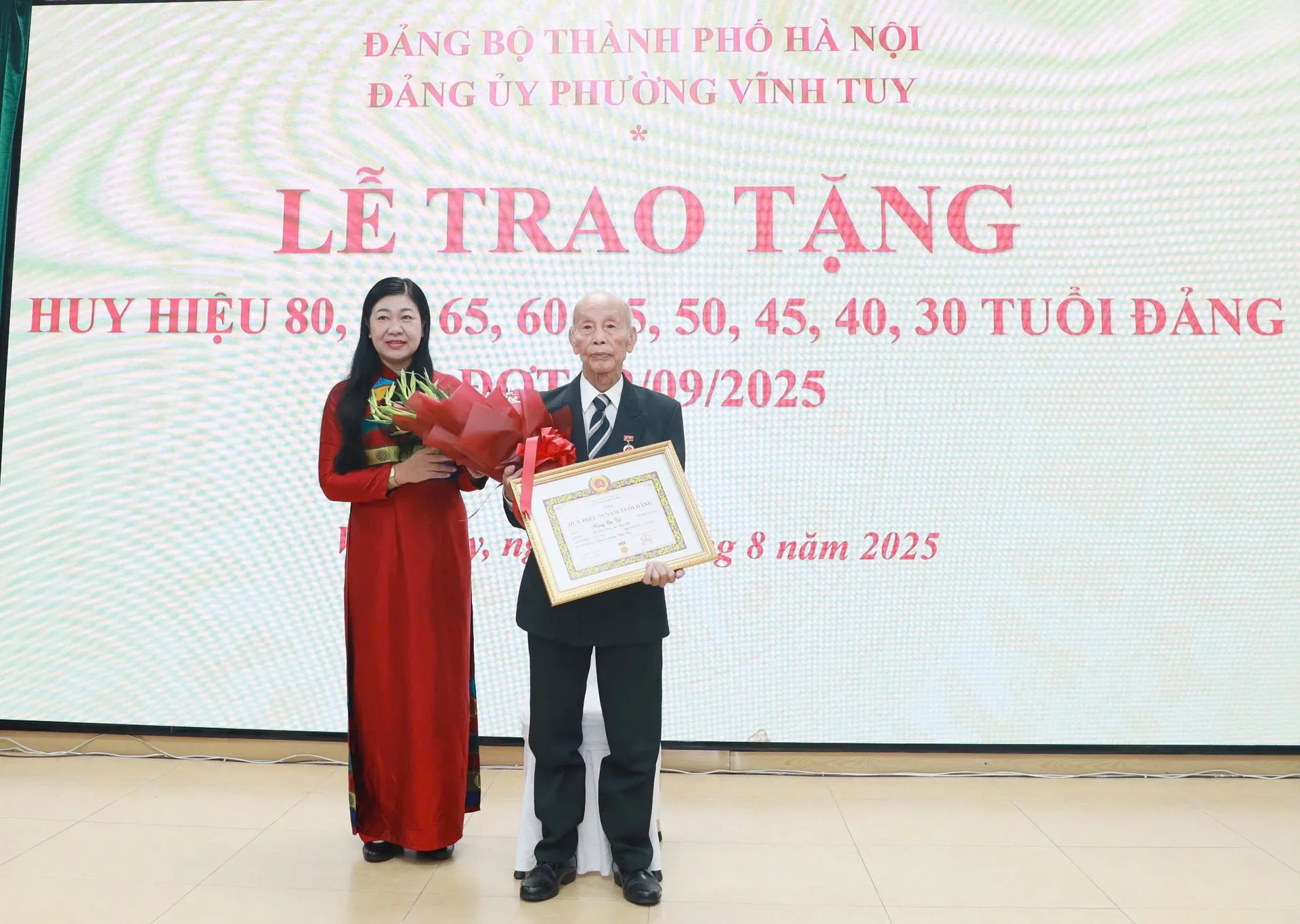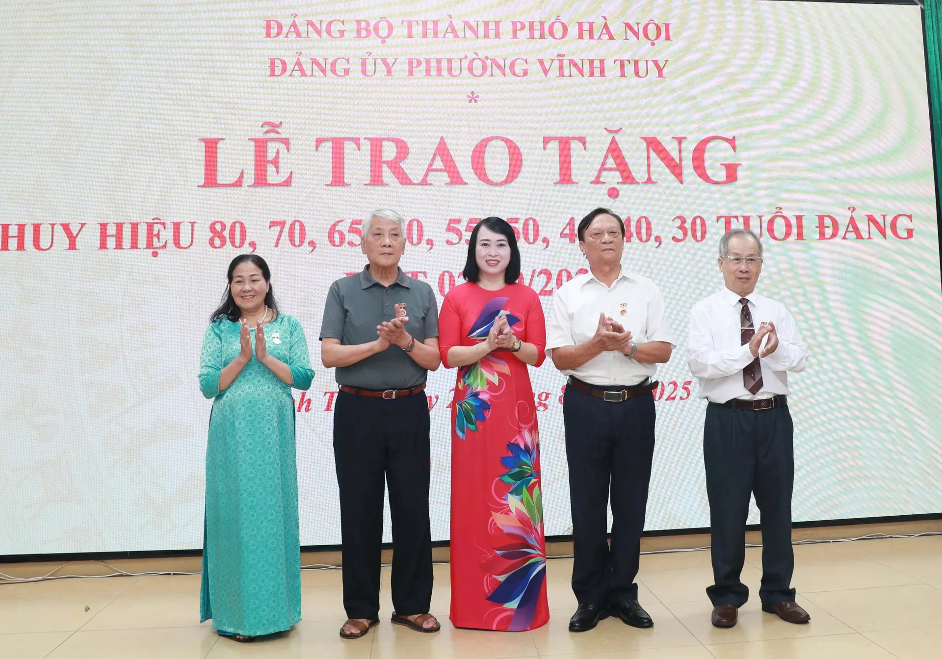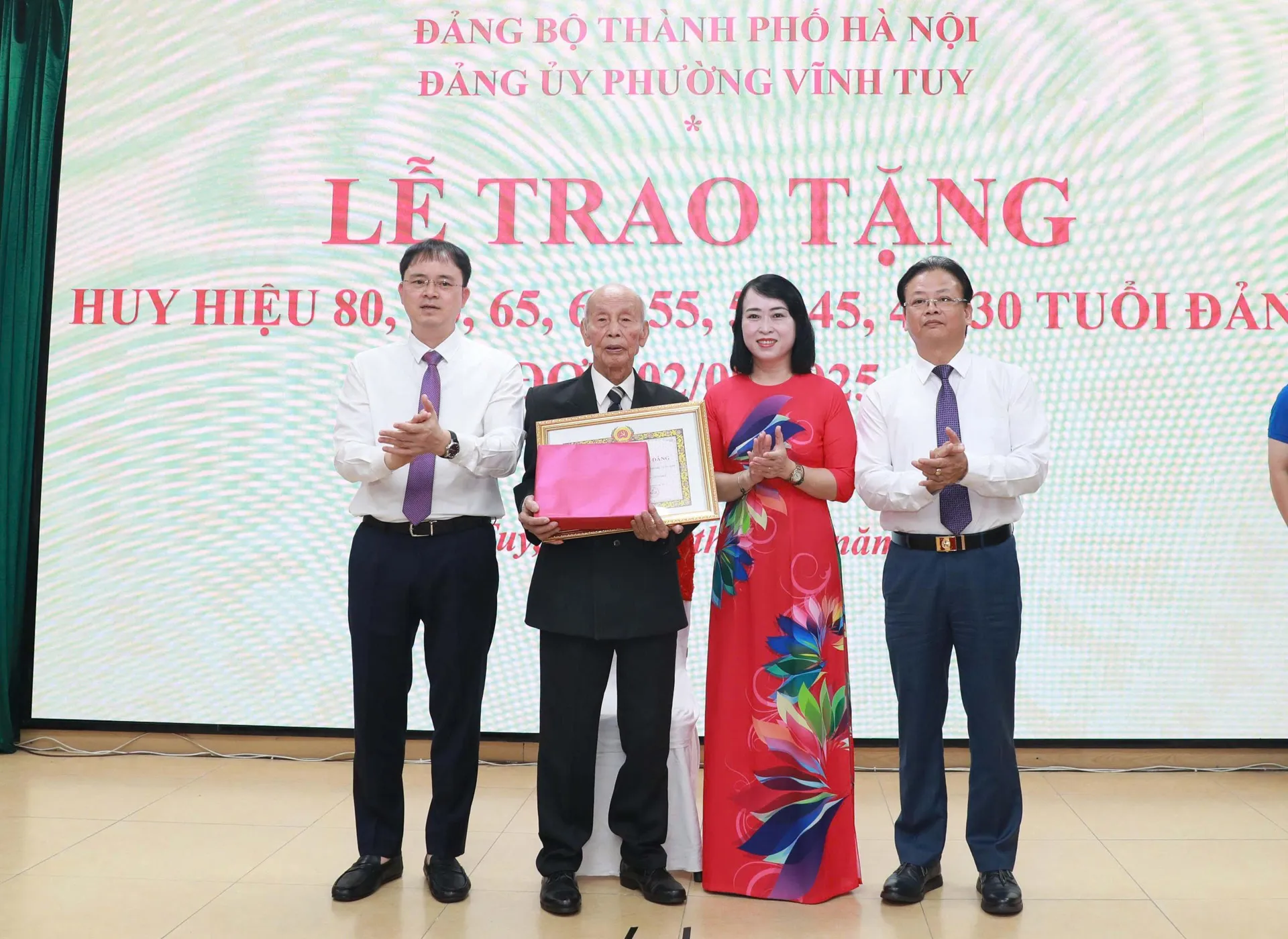Thay mặt lãnh đạo TP phát biểu tại đây, Chủ tịch Ủy ban MTTQ Việt Nam TP Nguyễn Lan Hương cho hay, dịp 2/9/2025, toàn Đảng bộ TP Hà Nội có 10.622 đảng viên được vinh dự đón nhận Huy hiệu của Đảng, 129 đảng viên nhận Huy hiệu từ 70 năm tuổi Đảng trở lên, trong đó Đảng bộ phường Vĩnh Tuy có 128 đảng viên vinh dự đón nhận Huy hiệu của Đảng, trong đó 2 đồng chí nhận Huy hiệu 80 năm tuổi Đảng và 1 đồng chí nhận Huy hiệu 70 năm tuổi Đảng.