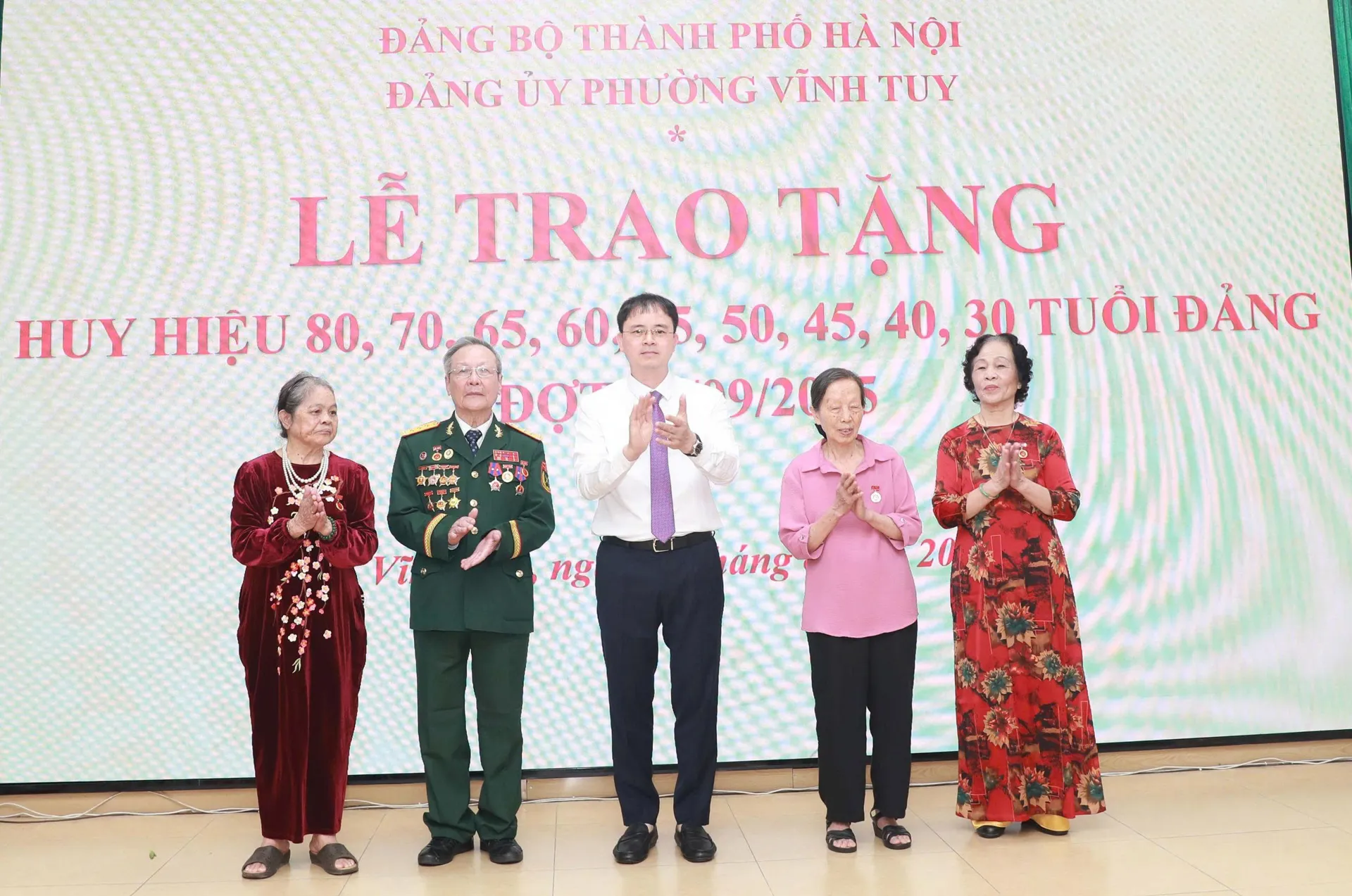 Cũng tại đây, Đảng ủy phường công bố Quyết định của Ban Thường vụ Thành ủy về việc trao Huy hiệu 65 năm tuổi Đảng tặng 1 đồng chí, Huy hiệu 60 năm tuổi Đảng tặng 10 đồng chí, Huy hiệu 55 năm tuổi Đảng tặng 5 đồng chí, Huy hiệu 50 năm tuổi Đảng tặng 13 đồng chí, Huy hiệu 45 năm tuổi Đảng tặng 46 đồng chí, Huy hiệu 40 năm tuổi Đảng tặng 34 đồng chí, Huy hiệu 30 năm tuổi Đảng tặng 16 đồng chí đang sinh hoạt tại Đảng bộ phường Vĩnh Tuy.