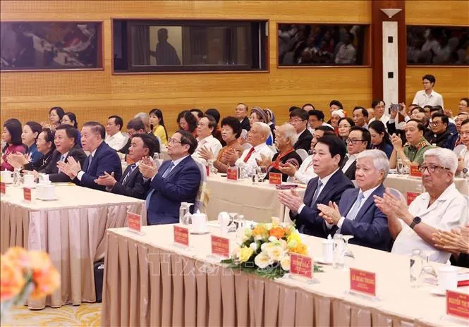 Chủ tịch nước Lương Cường và Thủ tướng Phạm Minh Chính cùng các đồng chí lãnh đạo, nguyên lãnh đạo Đảng, Nhà nước dự hội nghị. Ảnh: Lâm Khánh/TTXVN