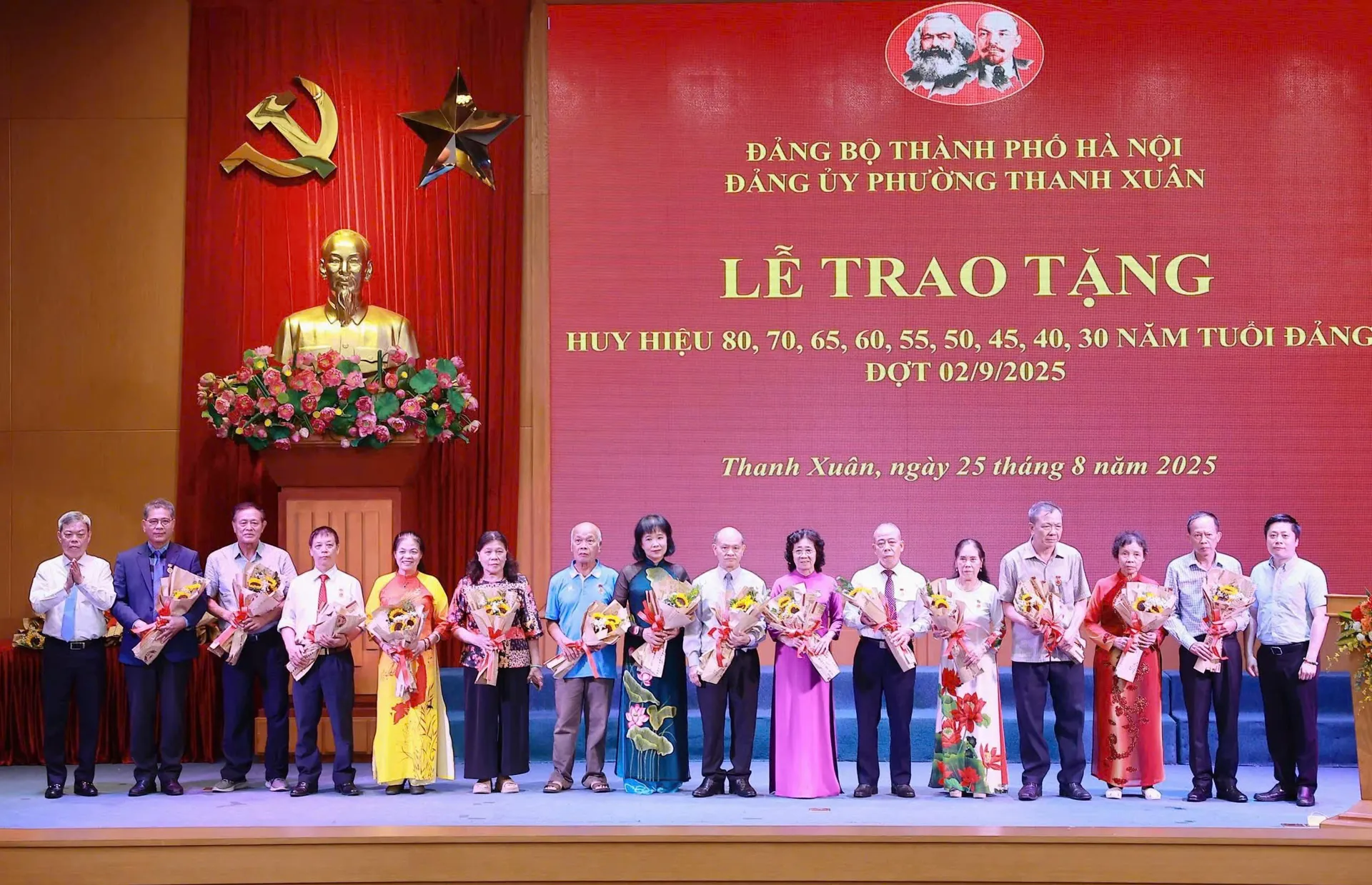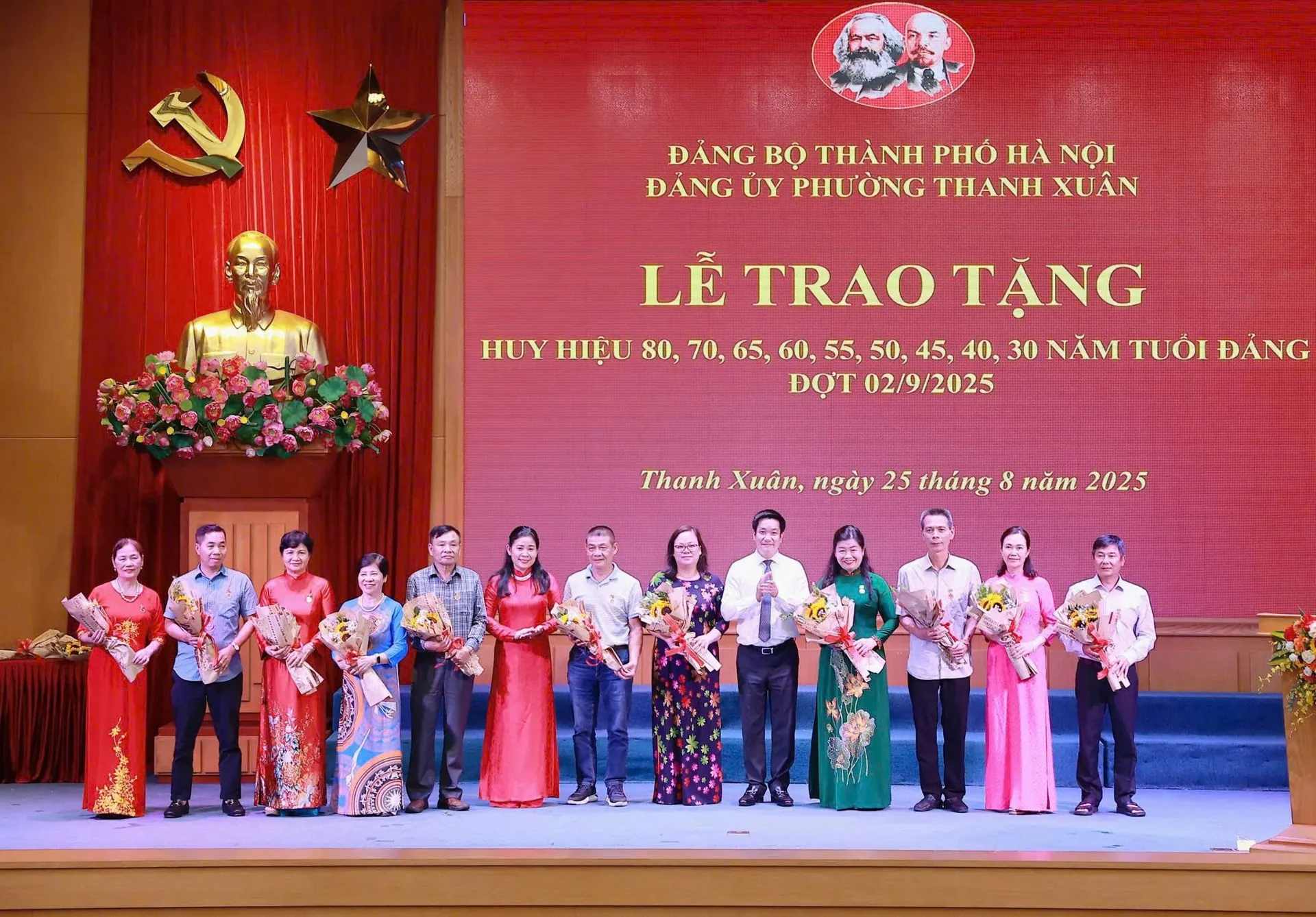 Đợt này, phường Thanh Xuân có 222 đảng viên được nhận Huy hiệu 80, 70, 60, 55, 50, 45, 40 và 30 năm tuổi Đảng. Trong đó, có 2 đảng viên nhận Huy hiệu 80 năm tuổi Đảng; 1 đảng viên nhận Huy hiệu 70 năm tuổi Đảng; 6 đồng chí nhận Huy hiệu 65 năm tuổi Đảng; 15 đồng chí Huy hiệu 60 năm tuổi Đảng; 13 đồng chí nhận Huy hiệu 55 năm tuổi Đảng; 22 đồng chí nhận Huy hiệu 50 năm tuổi Đảng; 47 đồng chí nhận Huy hiệu 45 năm tuổi Đảng; 66 đồng chí nhận Huy hiệu 40 năm tuổi Đảng; 50 đồng chí nhận Huy hiệu 30 năm tuổi Đảng.