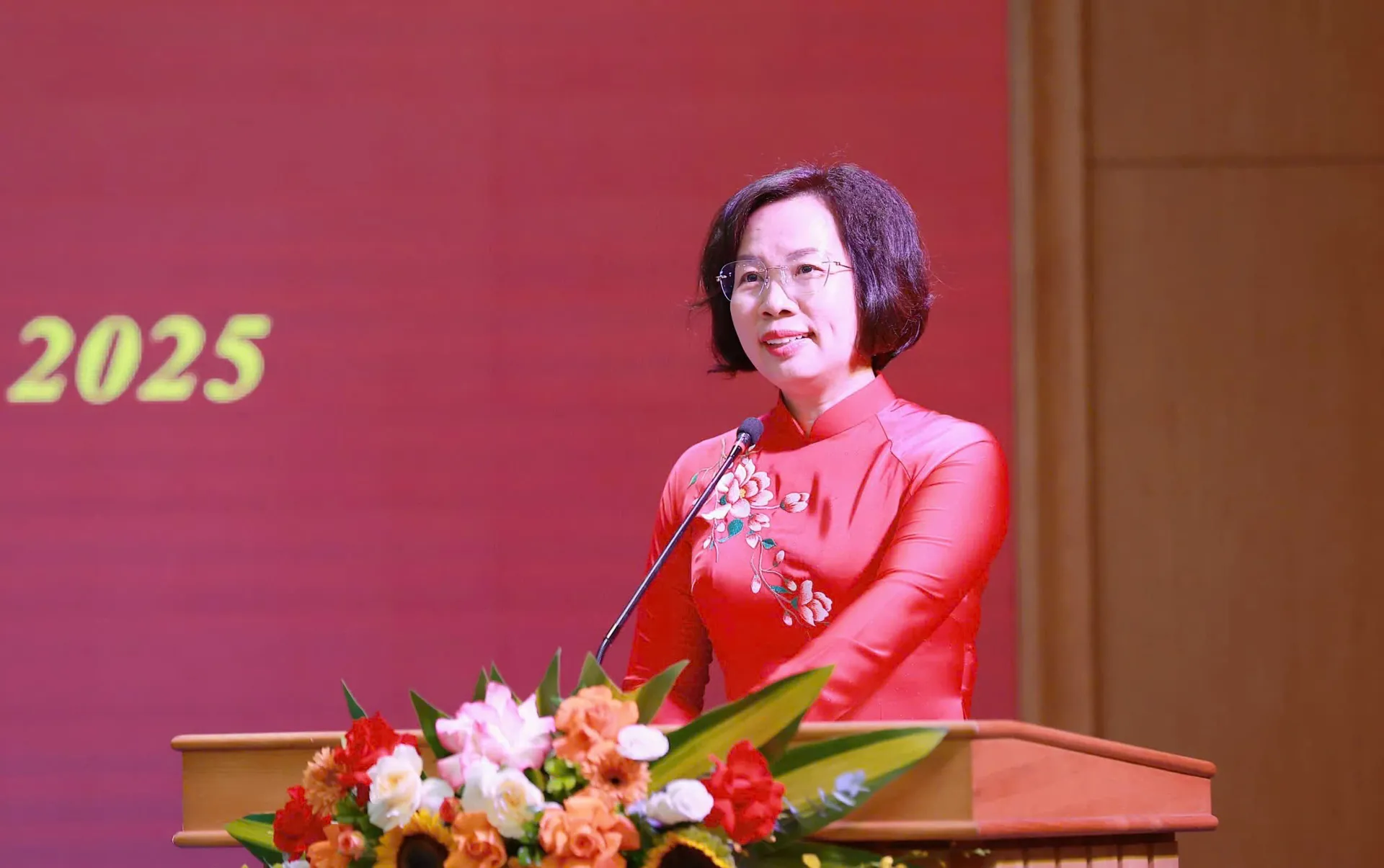 Ủy viên Ban Thường vụ Thành ủy, Phó Chủ tịch Thường trực Ủy ban MTTQ Việt Nam TP Hà Nội Bùi Huyền Mai phát biểu tại lễ trao Huy hiệu Đảng