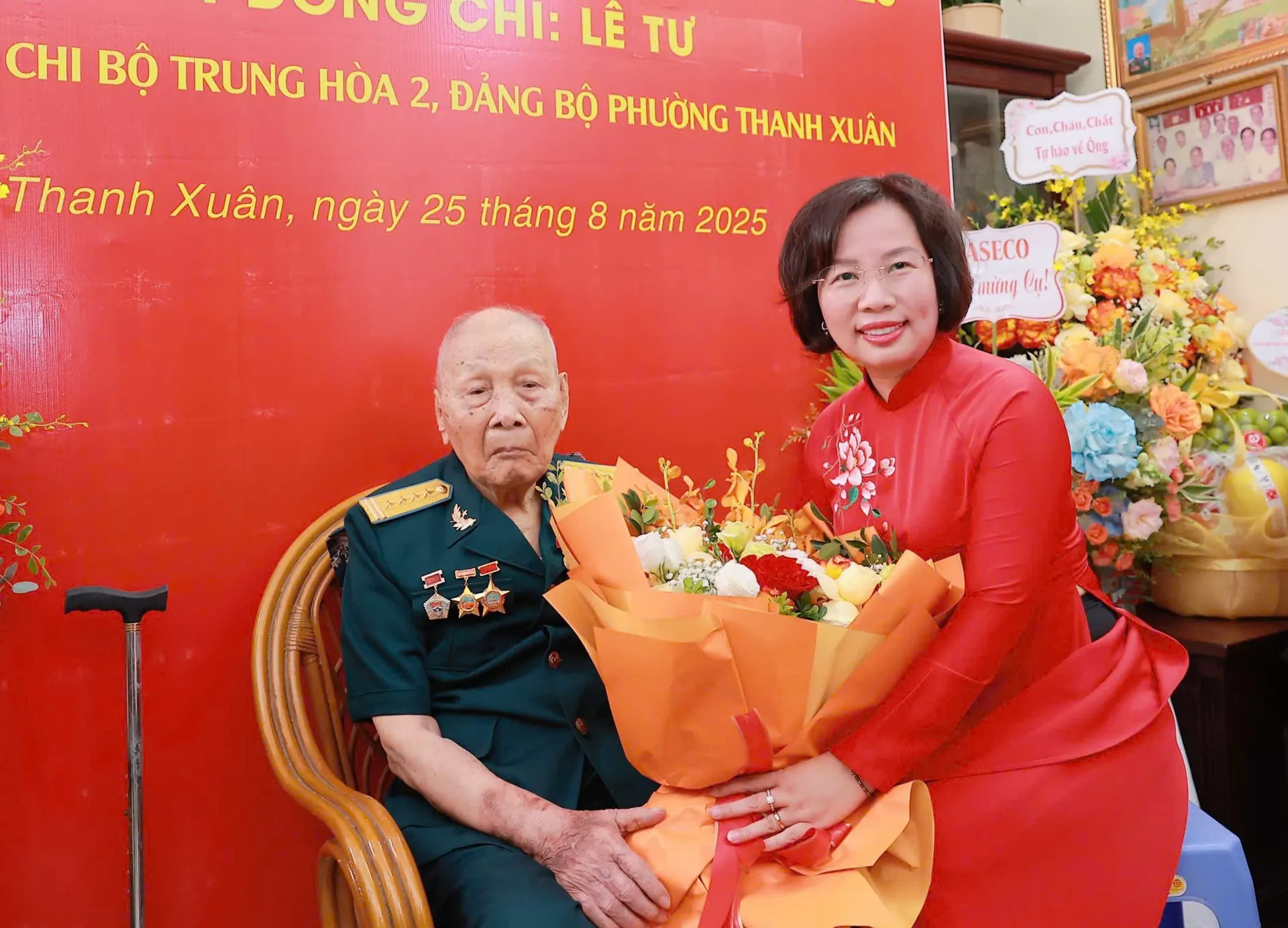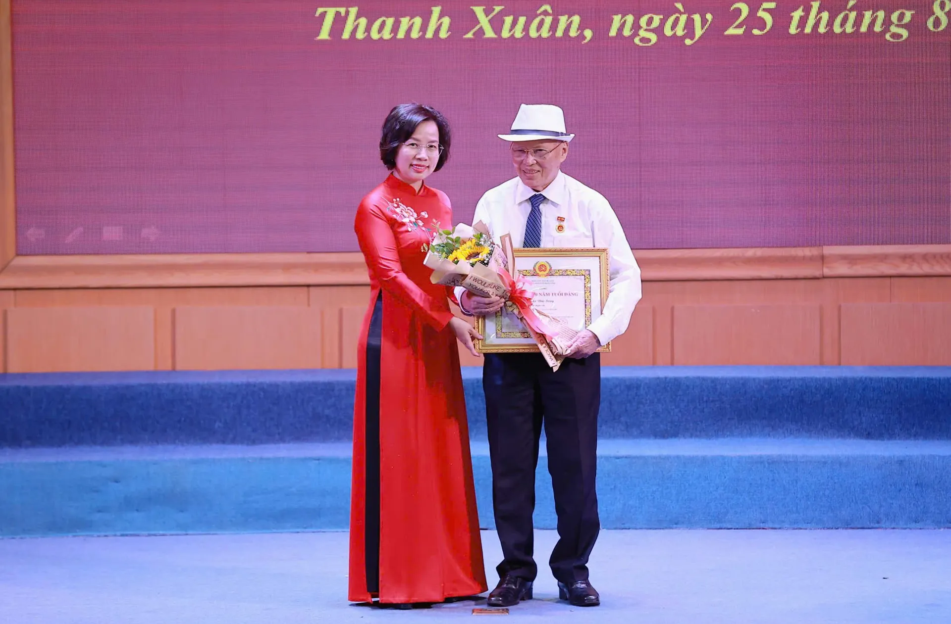 Bí thư Đảng ủy phường Thanh Xuân Nguyễn Huy Cường trao Huy hiệu Đảng cho đảng viên lão thành