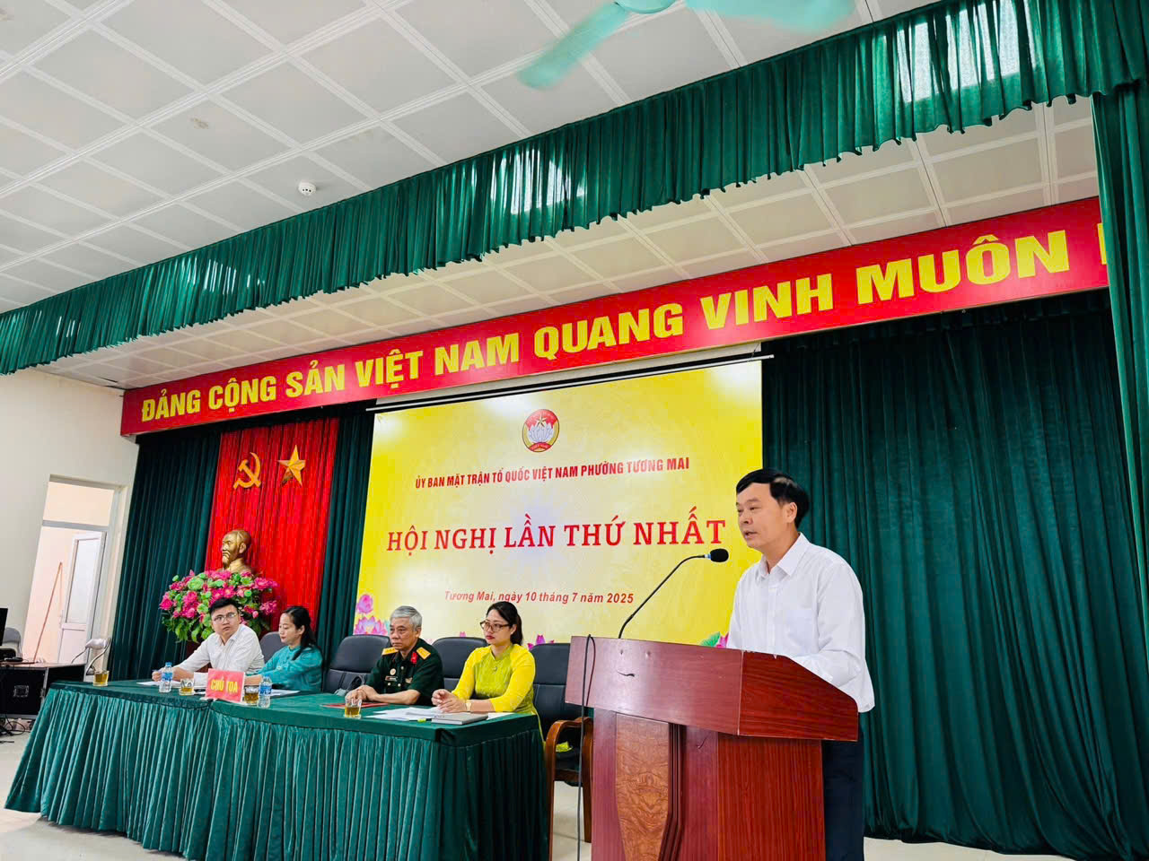 Sáng ngày 10/07/2025, Uỷ ban MTTQ Việt Nam phường Tương Mai tổ chức Hội nghị lần thứ nhất và triển khai các nhiệm vụ MTTQ 06 tháng cuối năm 2025. Dự hội nghị có các đồng chí: Nguyễn Tri Phương - Phó Bí thư Thường trực Đảng uỷ; Trần Thu Thuý – Thường vụ Đảng uỷ, Chủ tịch Uỷ ban MTTQ Việt Nam phường; Ban Thường trực, Uỷ viên uỷ ban MTTQ Việt Nam phường Tương Mai. Hội nghị đã được nghe công bố Quyết định số 575/QĐ-MTTQ-BTT ngày 26/6/2025 của Ban Thường trực Ủy ban MTTQ Việt Nam thành phố Hà Nội về việc công nhận Ủy viên Ủy ban và các chức danh trong Ban Thường trực Ủy ban MTTQ Việt Nam phường Tương Mai và Quyết định số 432/QĐ-MTTQ-BTT ngày 24/6/2025 của Ban Thường trực Ủy ban MTTQ Việt Nam thành phố Hà Nội về thành lập UB MTTQ phường Tương Mai, thành phố Hà Nội; Thông qua Quy chế Tạm thời hoạt động của UB MTTQ Việt Nam phường; Triển khai Chương trình công tác 6 tháng cuối năm 2025 và Phát động thi đua 6 tháng cuối năm 2025.